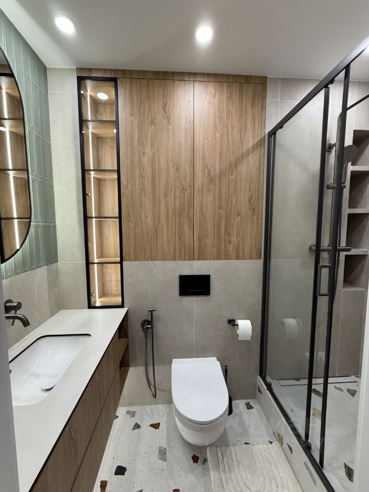 Встроенная техника: посудомойка, холодильник, духовка, микроволновка, варочная панель, вытяжка Большой телевизор 55 на регулируемом кронштейне (максимальный комфорт просмотра) Стиральная машина, водонагреватель, кондиционер Робот-пылесос, интернет + роутер, видеодомофон В ванне пол с подогревом Удобные системы хранения — всё продумано до мелочей
