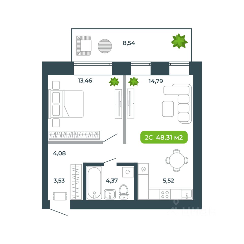 Продаётся студия в строящемся доме (Дом 13), срок сдачи: III-кв. 2026, общей площадью 48.31 кв.м., на 2 этаже. Жилой комплекс ''Ботаника'' от застройщика ''Ботаника Девелопмент'' расположен в южной части р.п. Кольцово по ул. Кольцевая.