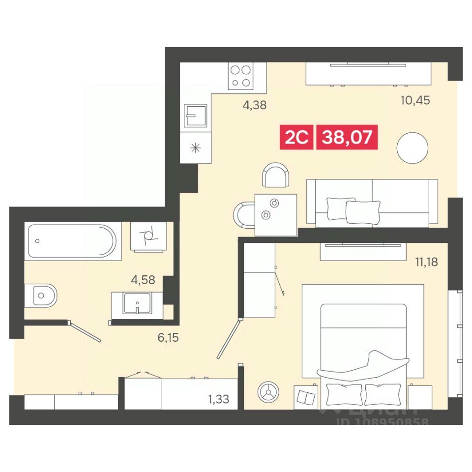 Общая площадь38,07 м2