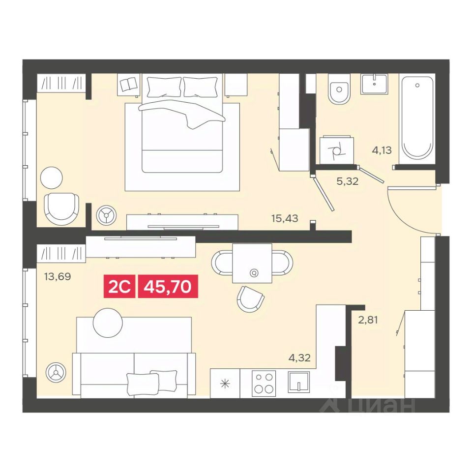 Общая площадь45,7 м2