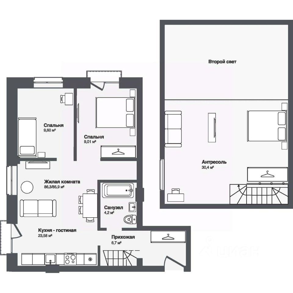 В комплексе представлены студии и 13-комнатные квартиры площадью от 30,2 до 91,9 м². Планировки продуманы для удобной жизни — просторные кухни-гостиные, террасы и панорамные окна наполняют квартиры светом.