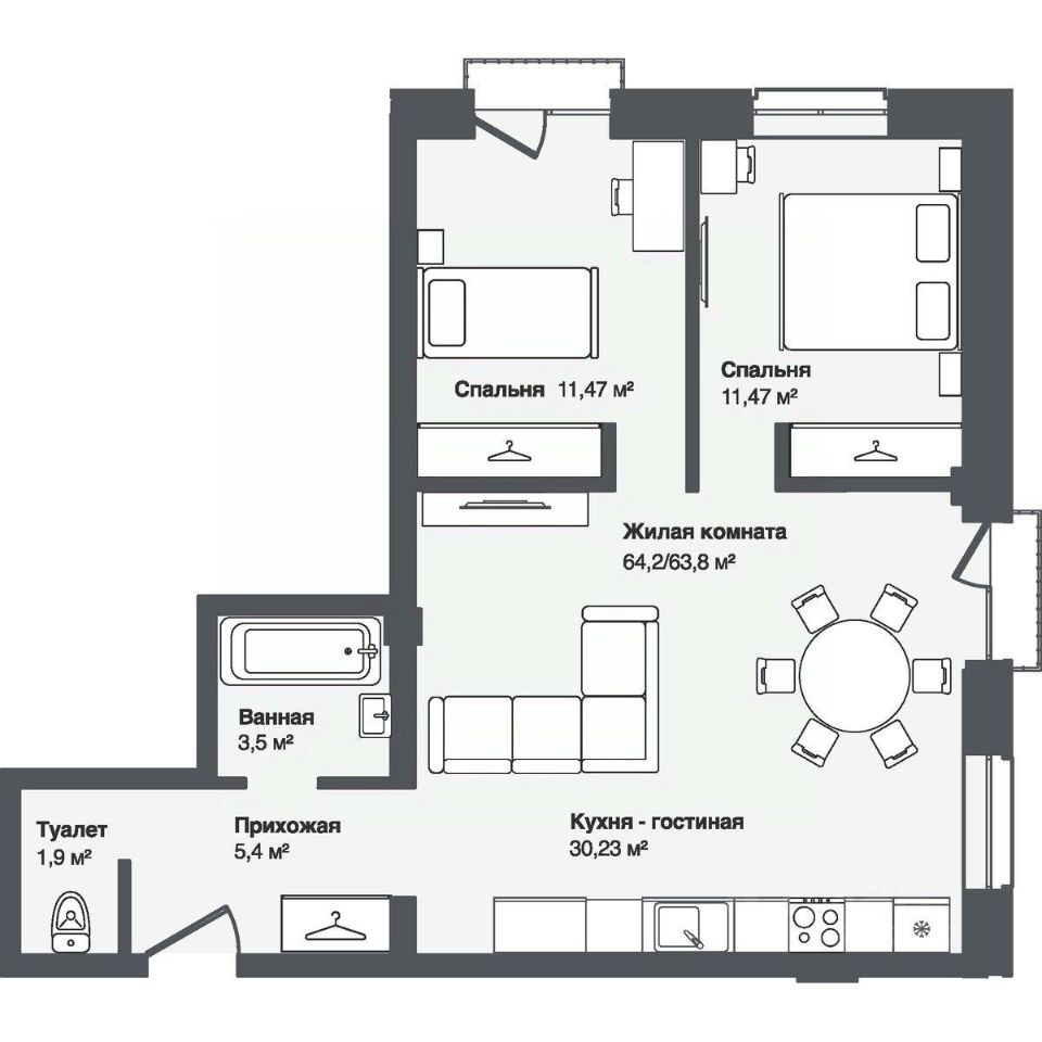 В комплексе представлены студии и 13-комнатные квартиры площадью от 30,2 до 91,9 м². Планировки продуманы для удобной жизни — просторные кухни-гостиные, террасы и панорамные окна наполняют квартиры светом.
