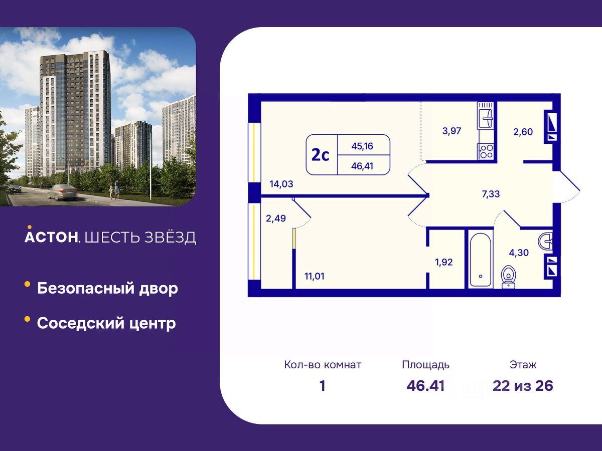 Просторная 1-комн. квартира с предчистовой отделкой в ЖК ''Астон. Шесть Звезд'' на 22 этаже. Общая площадь: 46.41 кв.м., жилая: 11.01 кв.м., площадь просторной кухни-столовой: 18 кв.м. Все окна выходят на одну сторону. В квартире одна лоджия, один совмещенный санузел. Высота потолков 2.65 м.