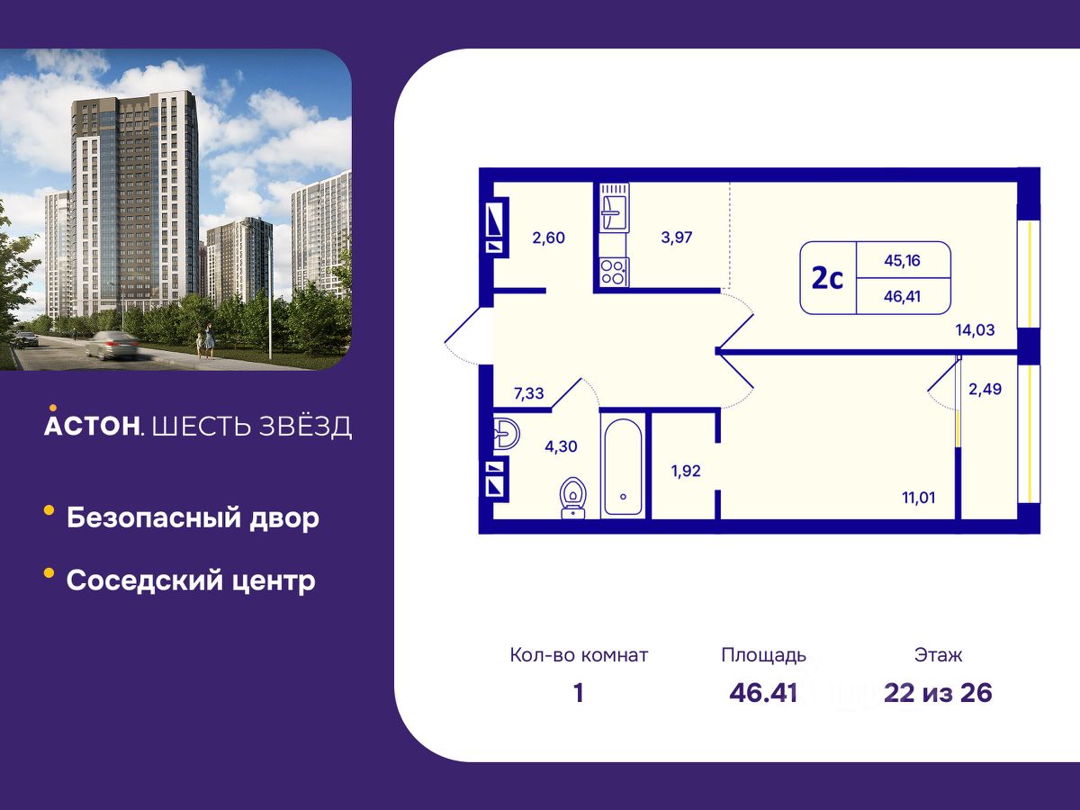 1-комн. квартира от застройщика с предчистовой отделкой в ЖК ''Астон. Шесть Звезд'' на 22 этаже. Общая площадь: 46.41 кв.м., жилая: 11.01 кв.м., площадь просторной кухни-столовой: 18 кв.м. Все окна выходят на одну сторону. В квартире одна лоджия, один совмещенный санузел. Высота потолков 2.65 м.