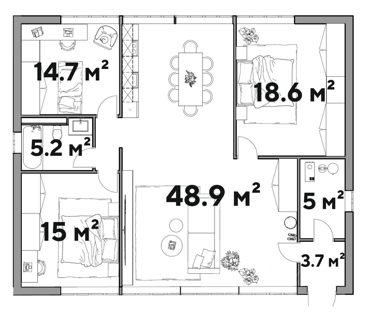 Благодаря конструкции дома планировка свободная, мы предлагаем следующую планировку: В доме 3 изолированные комнаты-спальни площадью 2х15м² и 18.6м², кухня-гостиная 48.9м², санузел 5.2м², прихожая 3.7м²