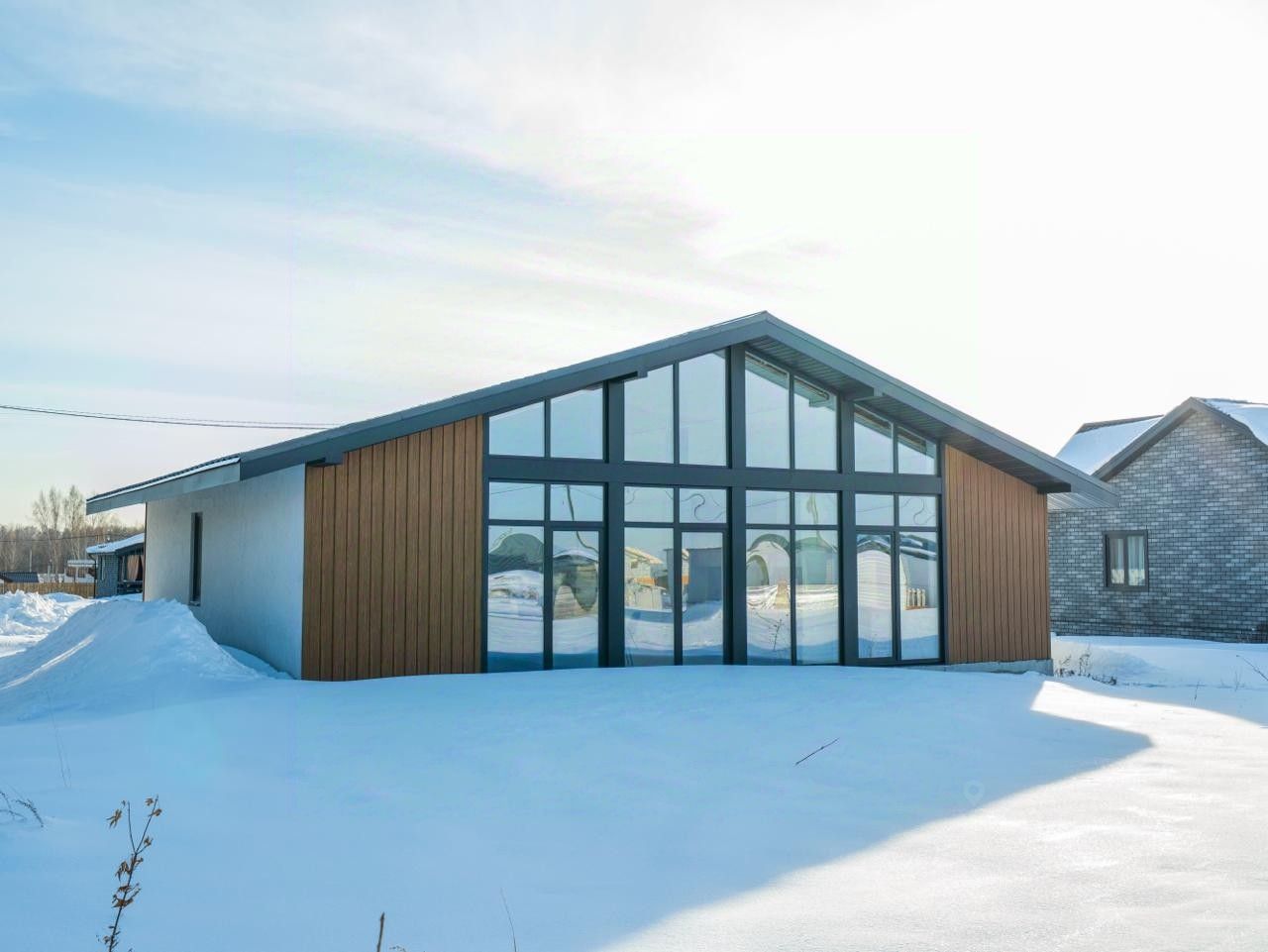 Крыша покрыта металлочерепицей, которая не только придаёт дому стильный вид, но и защищает его от непогоды.