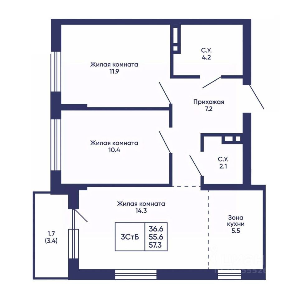 Общая площадь57,3 м2