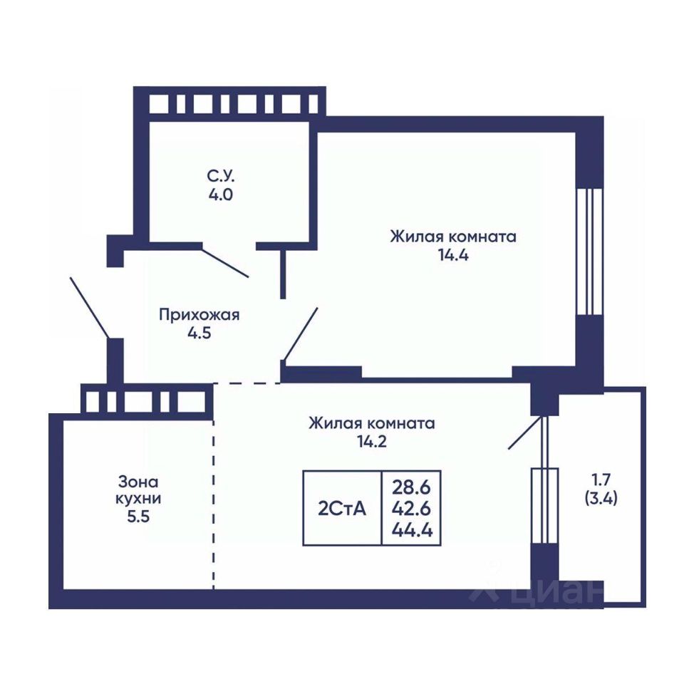 Общая площадь44,4 м2