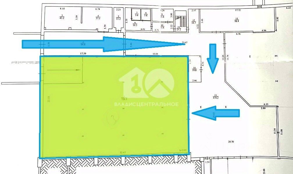 Общая площадь — 726 м². Помещение с высокими потолками, что позволяет эффективно использовать пространство под склад, производство, логистику, оптовую торговлю или сервисное направление.