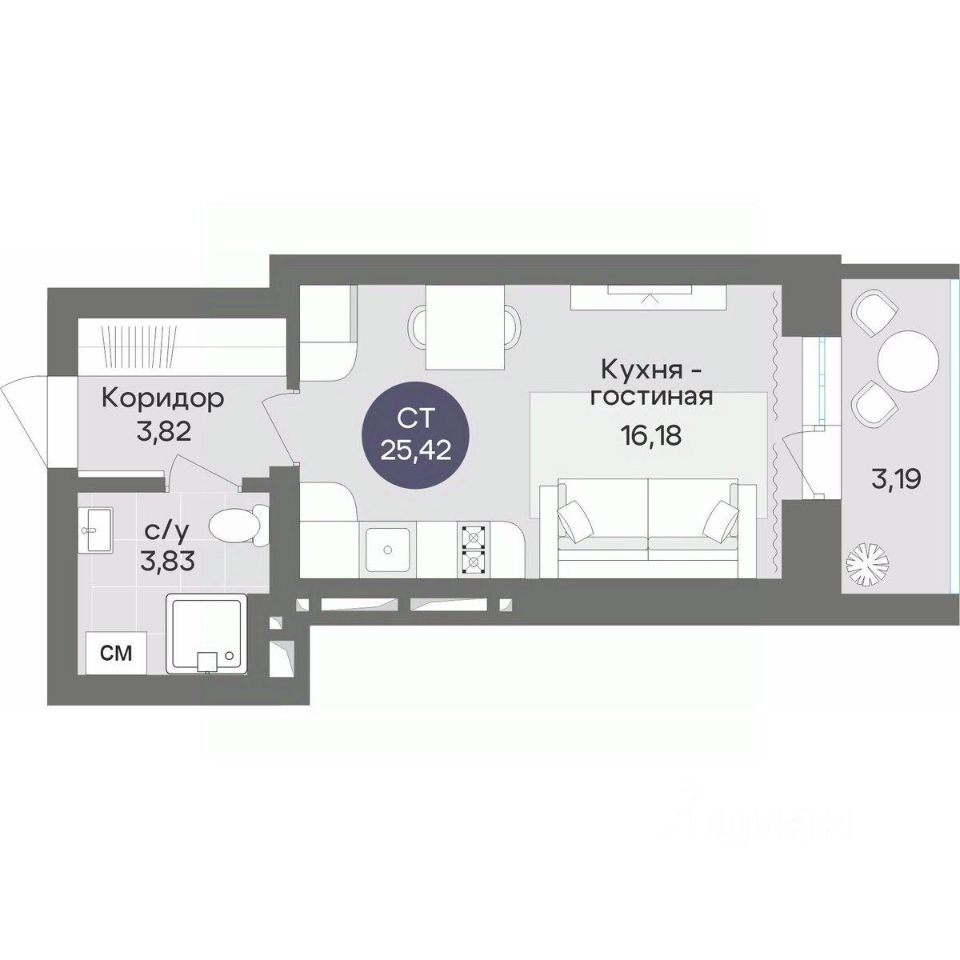 Общая площадь25,42 м2