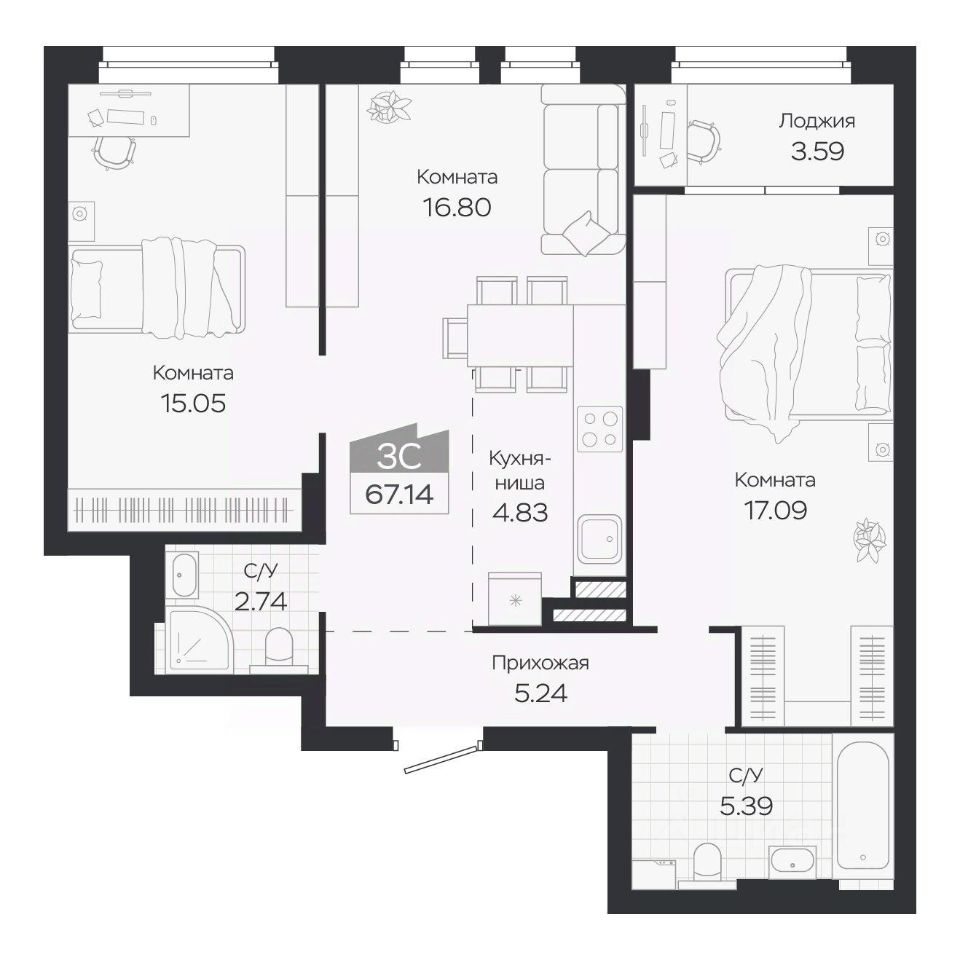 Продаётся 3-комнатная квартира в строящемся доме (Дом 3), срок сдачи: IV-кв. 2027, общей площадью 67.14 кв.м., на 2 этаже. Новый жилой комплекс ''Базилик'' от застройщика ''Группа Мета'' расположен в рп. Краснообск Новосибирской области на ул. Восточная.