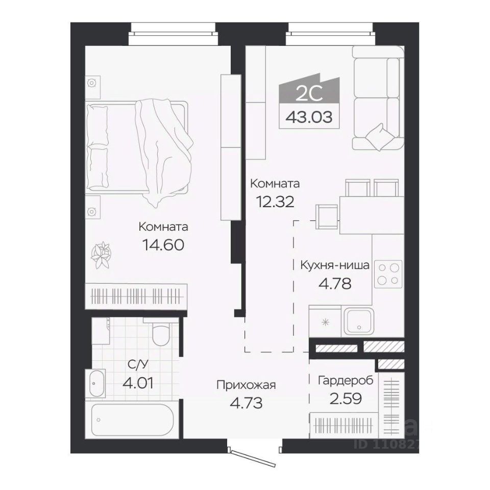 Продаётся 2-комнатная квартира в строящемся доме (Дом 3), срок сдачи: IV-кв. 2027, общей площадью 43.03 кв.м., на 7 этаже. Новый жилой комплекс ''Базилик'' от застройщика ''Группа Мета'' расположен в рп. Краснообск Новосибирской области на ул. Восточная.