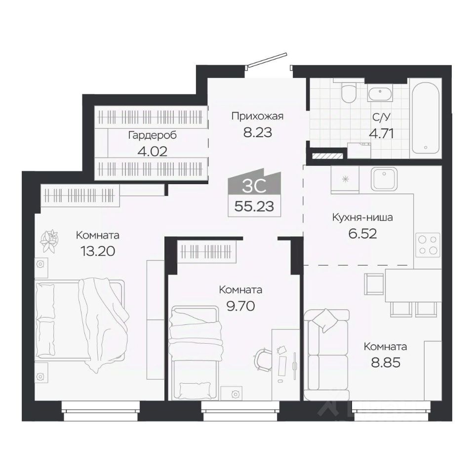Продаётся 3-комнатная квартира в строящемся доме (Дом 3), срок сдачи: IV-кв. 2027, общей площадью 55.23 кв.м., на 5 этаже. Новый жилой комплекс ''Базилик'' от застройщика ''Группа Мета'' расположен в рп. Краснообск Новосибирской области на ул. Восточная.