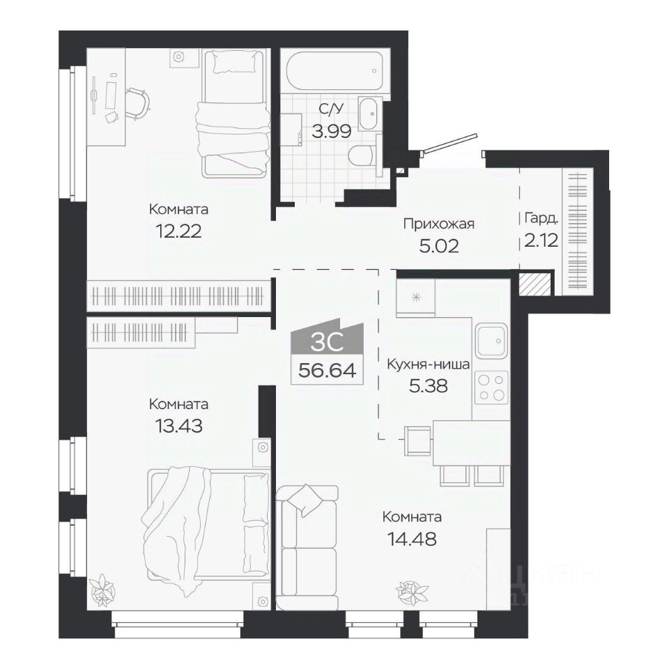Продаётся 3-комнатная квартира в строящемся доме (Дом 3), срок сдачи: IV-кв. 2027, общей площадью 56.64 кв.м., на 8 этаже. Новый жилой комплекс ''Базилик'' от застройщика ''Группа Мета'' расположен в рп. Краснообск Новосибирской области на ул. Восточная.