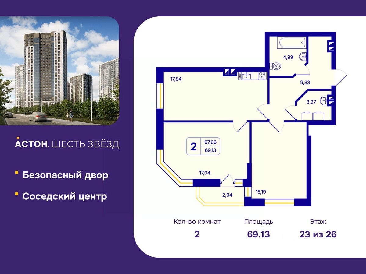 Продается 2-комн. квартира от застройщика с предчистовой отделкой в ЖК ''Астон. Шесть Звезд'' на 23 этаже. Общая площадь: 69.13 кв.м., жилая: 32.23 кв.м., площадь просторной кухни-столовой: 17.84 кв.м. Квартира угловая, идеально подойдет любителям тишины и панорамных видов. В квартире одна лоджия, один совмещенный и один раздельный санузел. Высота потолков 2.65 м.