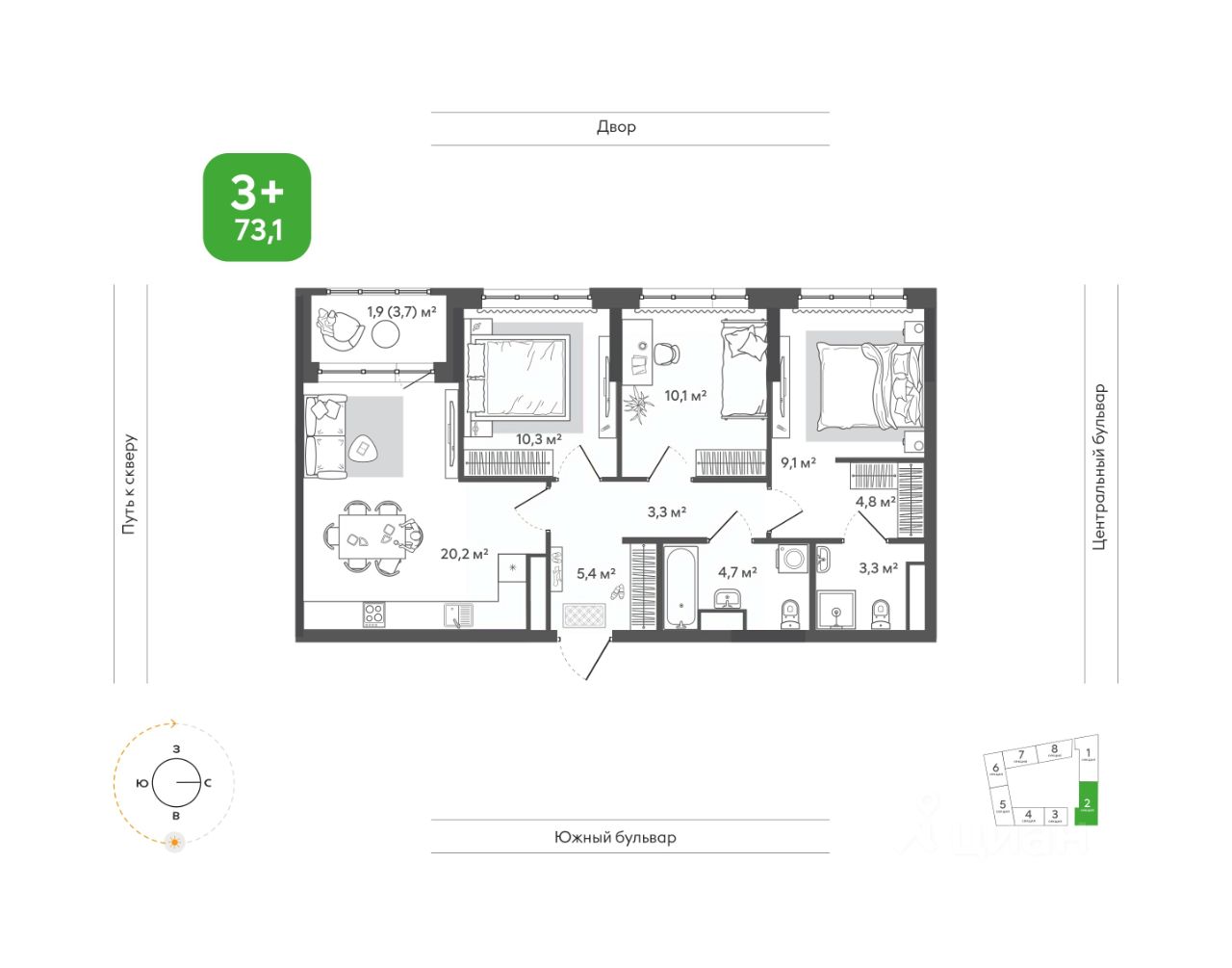 Продаётся 3-комнатная квартира в строящемся доме (Дом 1), срок сдачи: I-кв. 2028, общей площадью 73.1 кв.м., на 3 этаже. Жить в ритме природы, не теряя динамики города. В ''Сибирии'' свежий воздух встречается с динамикой города, создавая привилегию выбора: завтрак в кофейне на первом этаже дома или заряжающая пробежка в парке, культурный вечер в центре искусств или теплый семейный ужин на террасе. ''Сибирия'' становится частью нового городского кластера - с образовательной средой полного цикла, культурно-спортивным центром, медицинской инфраструктурой, современным центром искусств. Новые школы, детские сады, колледж с кампусом, новая поликлиника - все это делает жизнь комфортной и полноценной. ''Сибирия'' - это дом, где город открывает дверь в природу, а природа впускает в себя комфорт мегаполиса.