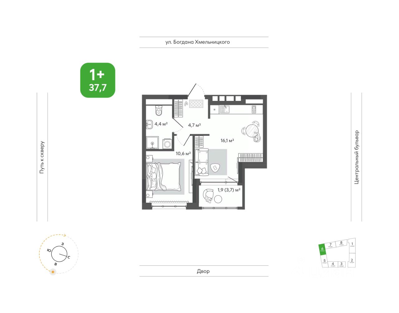 Продаётся 1-комнатная квартира в строящемся доме (Дом 1), срок сдачи: I-кв. 2028, общей площадью 37.7 кв.м., на 8 этаже. Жить в ритме природы, не теряя динамики города. В ''Сибирии'' свежий воздух встречается с динамикой города, создавая привилегию выбора: завтрак в кофейне на первом этаже дома или заряжающая пробежка в парке, культурный вечер в центре искусств или теплый семейный ужин на террасе. ''Сибирия'' становится частью нового городского кластера - с образовательной средой полного цикла, культурно-спортивным центром, медицинской инфраструктурой, современным центром искусств. Новые школы, детские сады, колледж с кампусом, новая поликлиника - все это делает жизнь комфортной и полноценной. ''Сибирия'' - это дом, где город открывает дверь в природу, а природа впускает в себя комфорт мегаполиса.