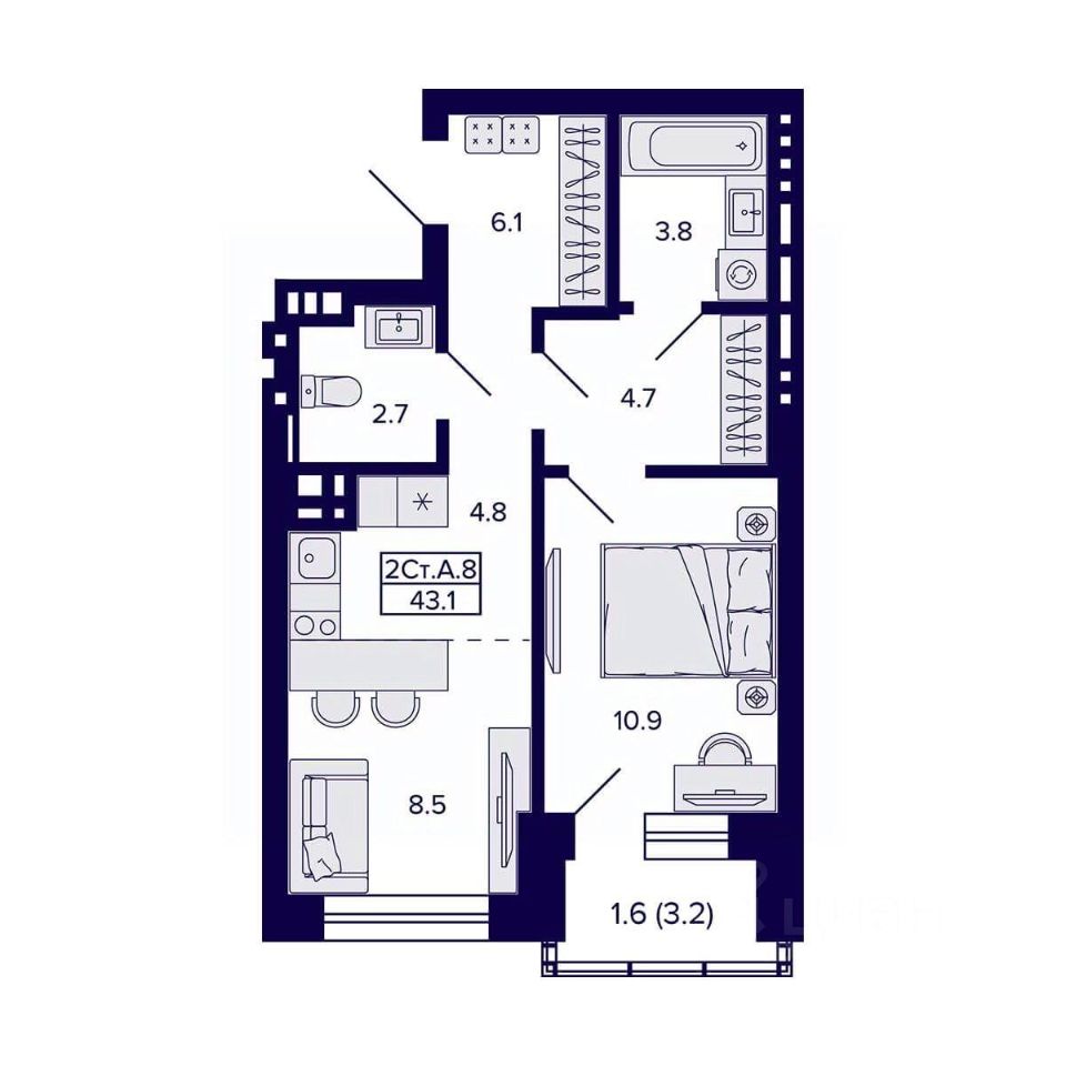 Продаётся 2-комнатная квартира в сданном доме (Дом 1), срок сдачи: IV-кв. 2025, общей площадью 43.1 кв.м., на 8 этаже. Жилой квартал ''Сподвижники'' от компании Vira.