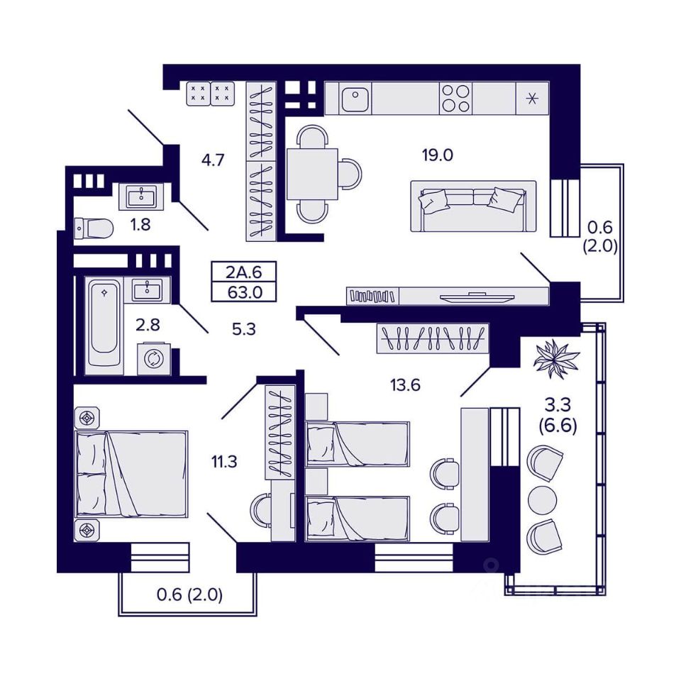 Продаётся 2-комнатная квартира в сданном доме (Дом 1), срок сдачи: IV-кв. 2025, общей площадью 63 кв.м., на 6 этаже. Жилой квартал ''Сподвижники'' от компании Vira.