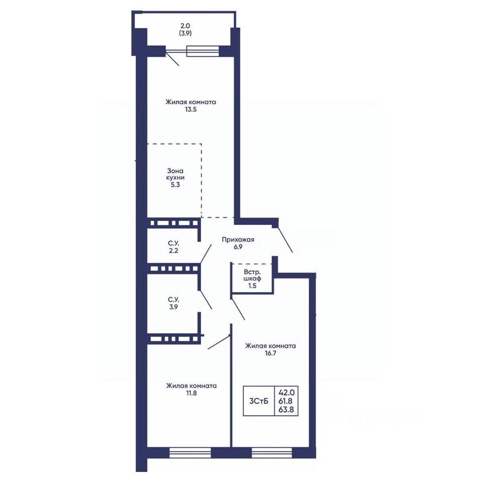 Продаётся 3-комнатная квартира в строящемся доме (Дом 3), срок сдачи: I-кв. 2028, общей площадью 63.8 кв.м., на 13 этаже. Жилой квартал ''Сподвижники'' от компании Vira.