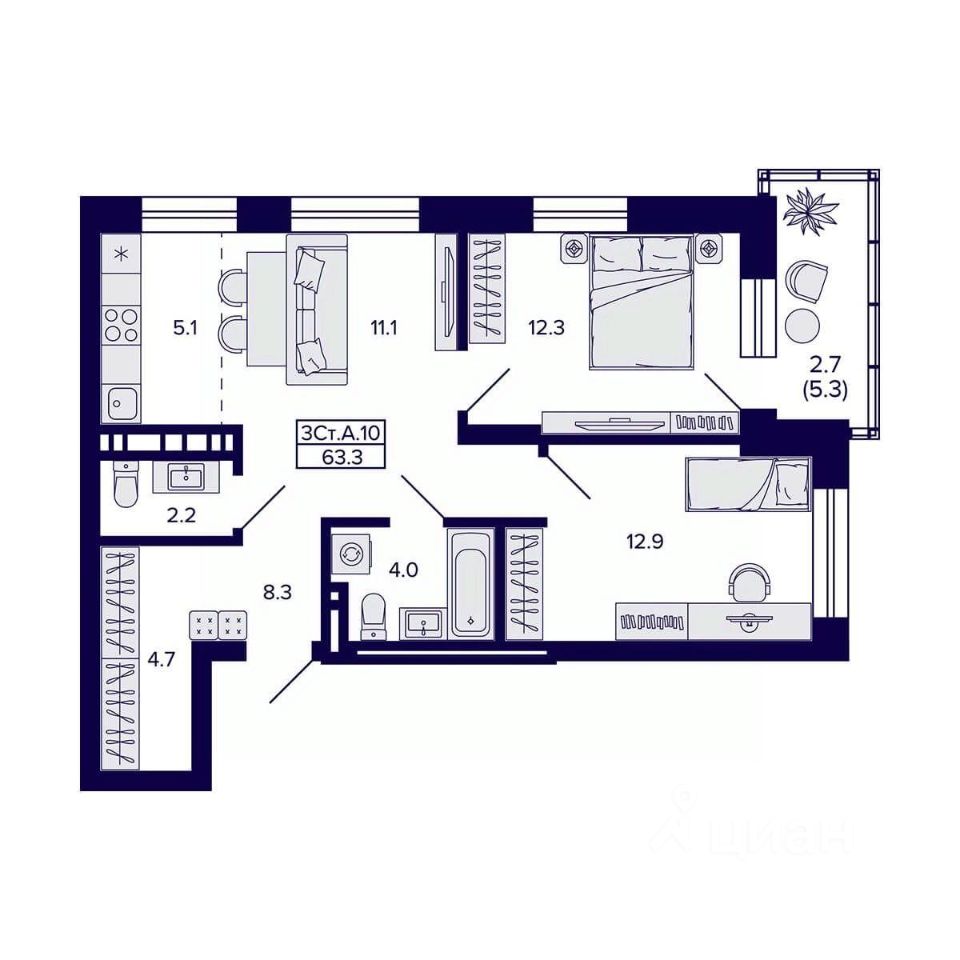 Продаётся 3-комнатная квартира в сданном доме (Дом 1), срок сдачи: IV-кв. 2025, общей площадью 63.3 кв.м., на 17 этаже. Жилой квартал ''Сподвижники'' от компании Vira.