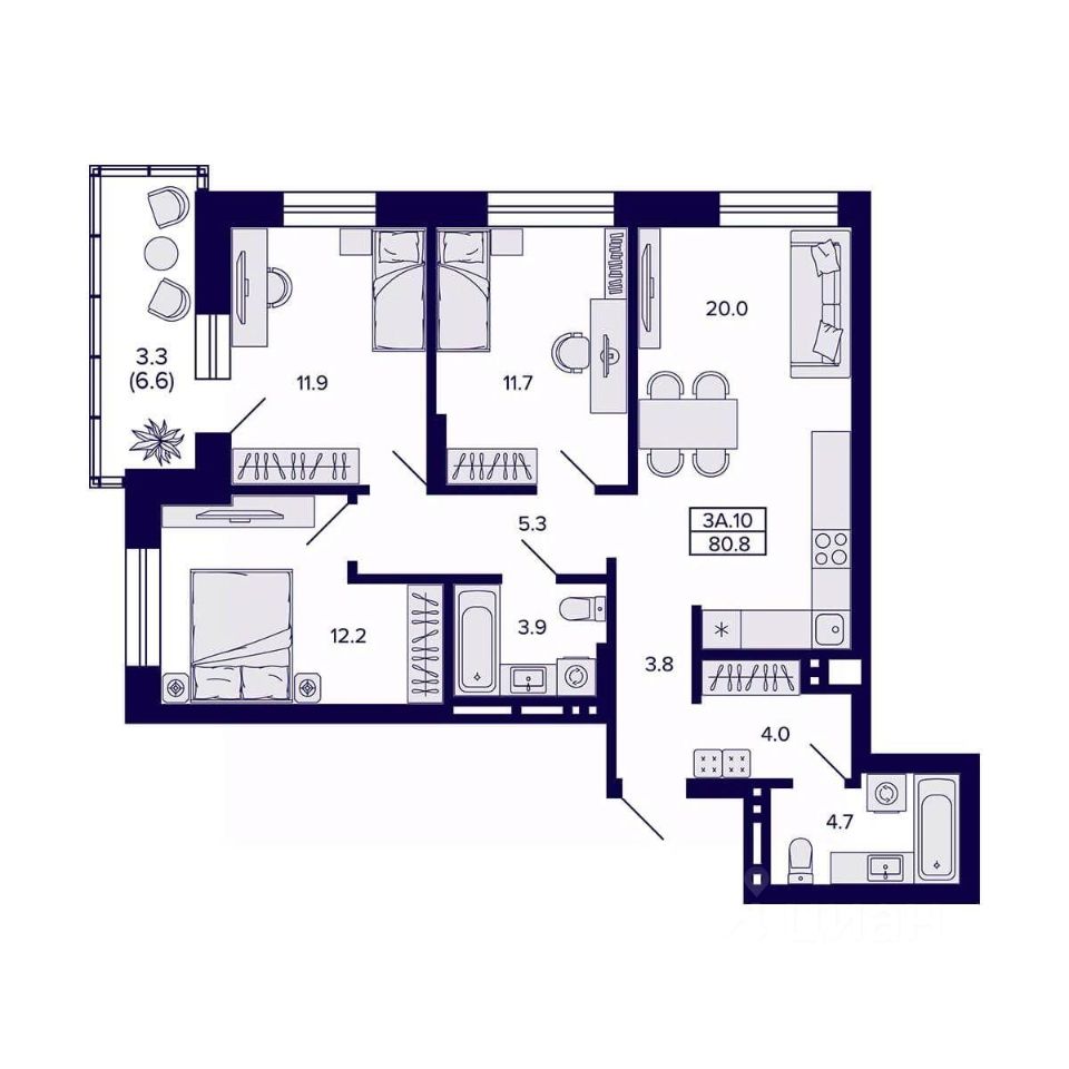 Продаётся 3-комнатная квартира в сданном доме (Дом 1), срок сдачи: IV-кв. 2025, общей площадью 80.8 кв.м., на 16 этаже. Жилой квартал ''Сподвижники'' от компании Vira.