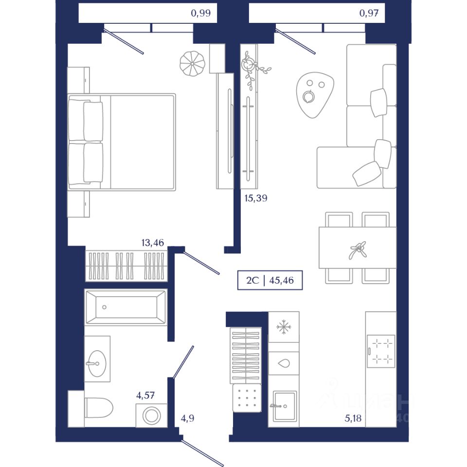 Продаётся 2-комнатная квартира в строящемся доме (Секция 1.1), срок сдачи: IV-кв. 2026, общей площадью 45.46 кв.м., на 2 этаже. Unity Center — квартал бизнес-класса в ''золотом'' центре Новосибирска.
