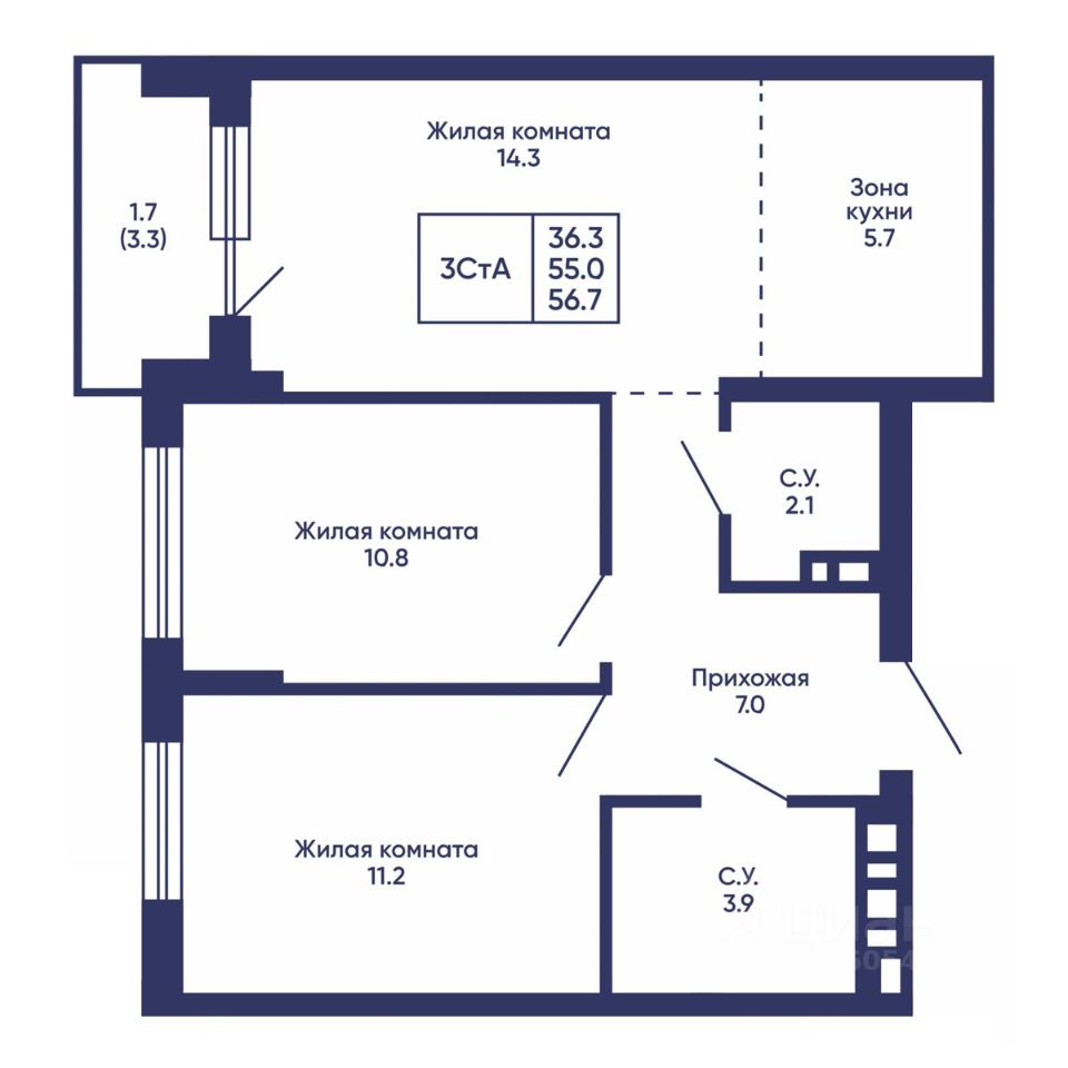 Продаётся 3-комнатная квартира в строящемся доме (Дом 3), срок сдачи: I-кв. 2028, общей площадью 56.7 кв.м., на 4 этаже. Жилой квартал ''Сподвижники'' от компании Vira.