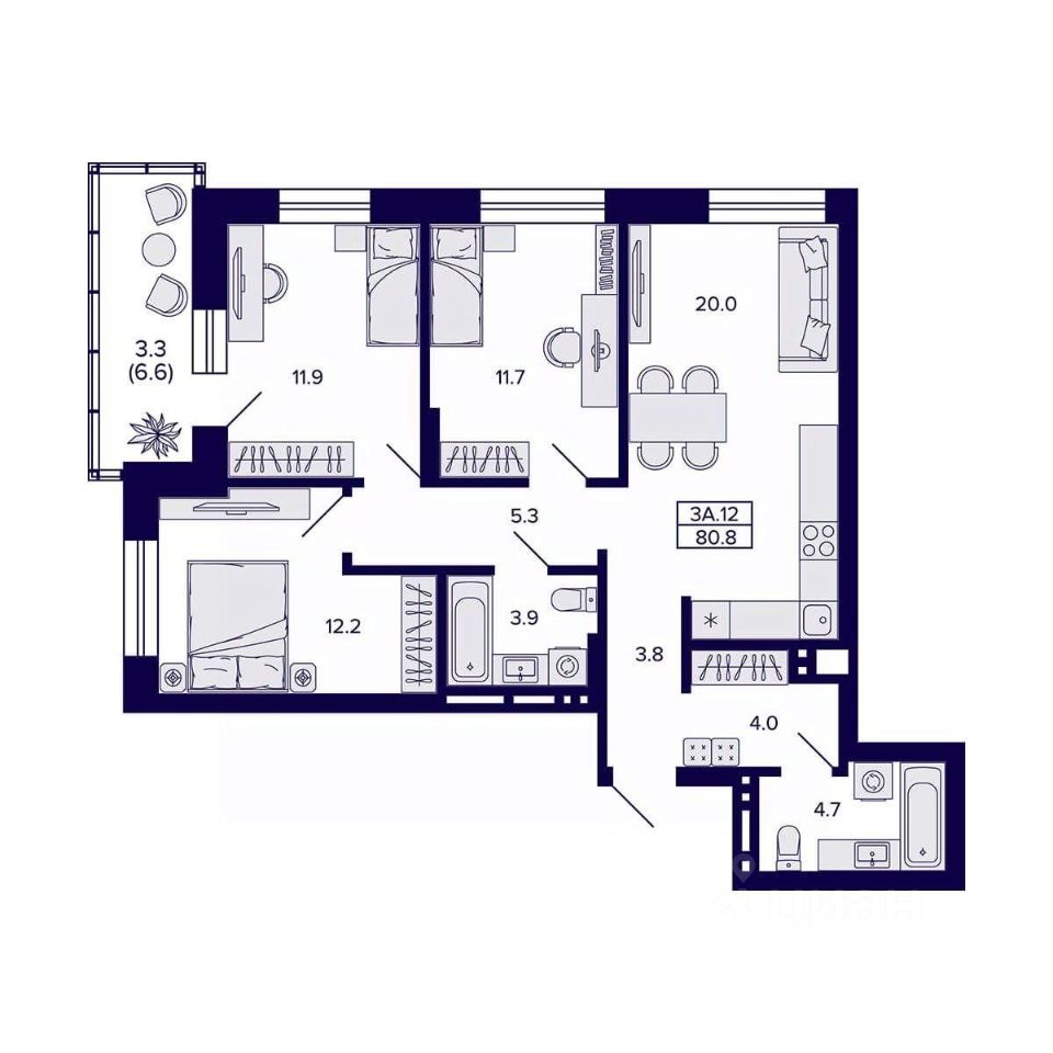 Продаётся 3-комнатная квартира в сданном доме (Дом 1), срок сдачи: IV-кв. 2025, общей площадью 80.8 кв.м., на 20 этаже. Жилой квартал ''Сподвижники'' от компании Vira.