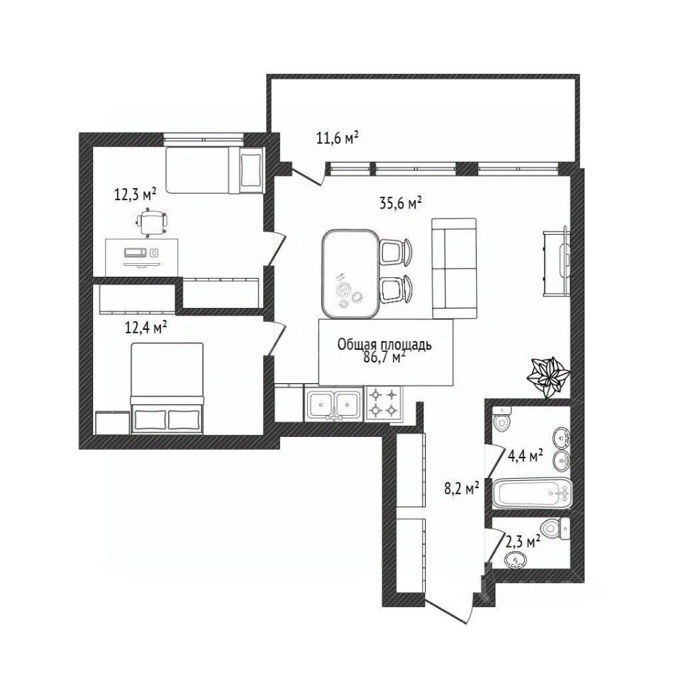 Площадь 86 м² — идеально для семьи: отдельные комнаты для родителей и детей, большая гостиная с кухней и балконом. 12й этаж даёт панорамный вид , много света и тишину. Современный дом: потолки 2,7 м, хорошая шумоизоляция, тихие лифты, энергоэффективные решения.