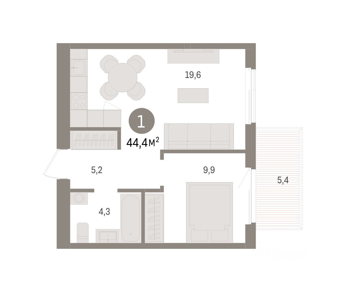 Квартира с кухней-гостиной и одной спальней в жилом районе ''Пшеница''. Особенности планировки: балкон, предчистовая отделка. квартиры в нашей базе: ПШЦ05.2-Ж7.3.2.