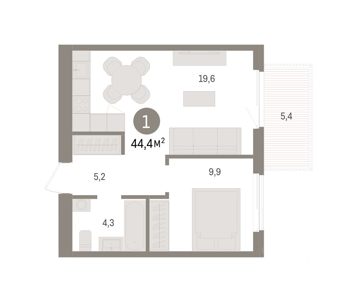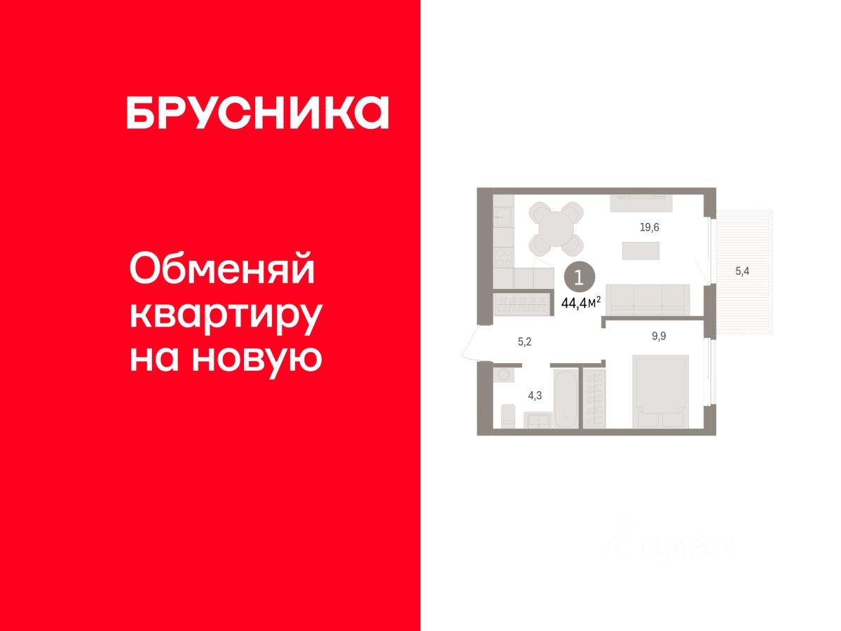 Квартира с кухней-гостиной и одной спальней в жилом районе ''Пшеница''. Особенности планировки: балкон, предчистовая отделка. квартиры в нашей базе: ПШЦ05.2-Ж6.5.3.
