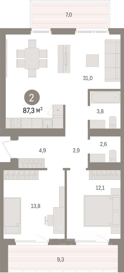 Продаётся 2-комнатная квартира в строящемся доме (Дом 5.2), срок сдачи: IV-кв. 2027, общей площадью 87.3 кв.м., на 6 этаже. РайонТретье кольцо ВАСХНИЛаНовый жилой район расположен в поселке Краснообск на левом берегу Оби, на пересечении улицы Центральная и Советского шоссе. Рядом — остановки транспорта, выезды на транспортные магистрали. До Бугринского моста — 15 минут на автомобиле. До станции метро ''Площадь Маркса'' — 35 минут на автобусе, 20 минут на автомобиле. В 15-20 минутах от жилого района расположен крупный ТРЦ ''Мега''. Внутри посёлка сформирована необходимая инфраструктура: лицей, школы, детские сады, больница, поликлиника, частные медицинские центры, магазины, спортивные клубы. Рядом находится лесопарк имени академика Синягина и Обское водохранилище.ПроектКвартальная застройка''Пшеница'' представляет собой крупный жилой район на месте ''третьего кольца'' ВАСХНИЛа. Это квартальная застройка домами невысокой этажности 4-6 и 7-9 этажей, с закрытыми от машин безопасными дворами, спортивными площадками и детскими зонами. Достопримечательность района круговой зелёный бульвар, который объединит жилые дома с камерными дворами, пешеходными и велосипедными маршрутами, прилегающим лесопарком. На первых этажах домов расположены коммерческие помещения с повседневными сервисами для жителей.ДомЕвропейская архитектураПервая очередь строительства состоит из двух секционных домов г-образной формы 7-9 этажей, которые образуют квартал. Фасады облицованы керамическим кирпичом и архитектурным бетоном. Первые этажи высокие и оформлены прозрачным панорамным остеклением со стороны улицы. Контрастное горизонтальное разделение объёма зданий цветом и фактурами придаёт им человеческий масштаб. Дома не выглядят монолитными и тяжеловесными. Открытые балконы, прогулочные террасы и террасы на первых и последних этажах задают динамику фасада. Элементы озеленения на кровле оживляют его и делают сопричастным окружающему ландшафту.БульварЗелёный кольцевой паркКруговой бульвар связывает район, объединяя жильё с природным ландшафтом, зонами активности и отдыха, пешеходными и велосипедными маршрутами. Парковое пространство отделяет застройку от существующих участков леса. Бульвар встраивается в смежные пространства лесопарка, камерные сады дворов, зелёные аллеи и тротуары. Он имеет три уровня: деревья, кустарники и травы, и видоизменяется в дизайне. Вдоль зелёного кольца проходит велодорожка: она понижается, проходя через дворы и повышается в местах пересечения с дорогой.ДворКамерный двор-садЗелёныи двор устроен как полуприватное пространство, безопасное для игр детеи и комфортное для отдыха взрослых. Живая изгородь окружает двор, формируя теневые ниши, и используется в качестве границы частных палисадников и коммерческих сервисов. Во дворах расположены детские площадки, беседки-перголы и скамейки. Зоны активности и спорта вынесены в общественные пространства района.