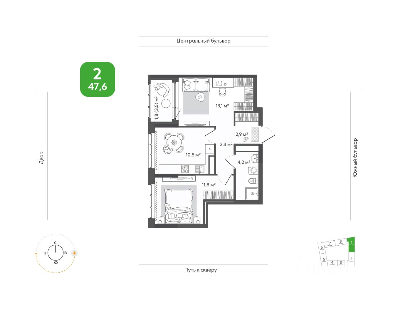 Продаётся 2-комнатная квартира в строящемся доме (Дом 1), срок сдачи: I-кв. 2028, общей площадью 47.6 кв.м., на 14 этаже. Жить в ритме природы, не теряя динамики города. В ''Сибирии'' свежий воздух встречается с динамикой города, создавая привилегию выбора: завтрак в кофейне на первом этаже дома или заряжающая пробежка в парке, культурный вечер в центре искусств или теплый семейный ужин на террасе. ''Сибирия'' становится частью нового городского кластера - с образовательной средой полного цикла, культурно-спортивным центром, медицинской инфраструктурой, современным центром искусств. Новые школы, детские сады, колледж с кампусом, новая поликлиника - все это делает жизнь комфортной и полноценной. ''Сибирия'' - это дом, где город открывает дверь в природу, а природа впускает в себя комфорт мегаполиса.