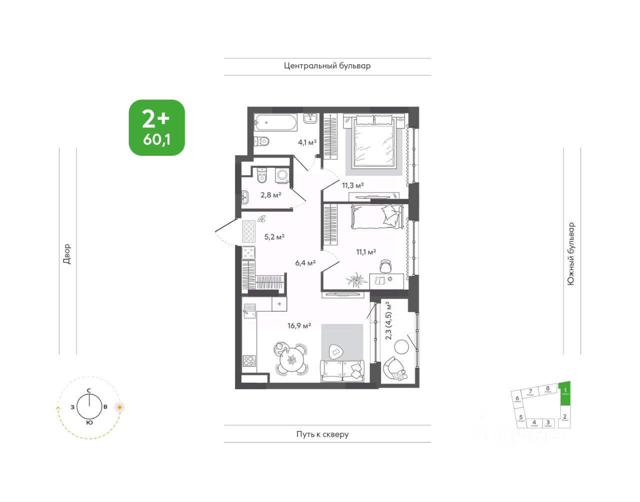Продаётся 2-комнатная квартира в строящемся доме (Дом 1), срок сдачи: I-кв. 2028, общей площадью 60.1 кв.м., на 9 этаже. Жить в ритме природы, не теряя динамики города. В ''Сибирии'' свежий воздух встречается с динамикой города, создавая привилегию выбора: завтрак в кофейне на первом этаже дома или заряжающая пробежка в парке, культурный вечер в центре искусств или теплый семейный ужин на террасе. ''Сибирия'' становится частью нового городского кластера - с образовательной средой полного цикла, культурно-спортивным центром, медицинской инфраструктурой, современным центром искусств. Новые школы, детские сады, колледж с кампусом, новая поликлиника - все это делает жизнь комфортной и полноценной. ''Сибирия'' - это дом, где город открывает дверь в природу, а природа впускает в себя комфорт мегаполиса.
