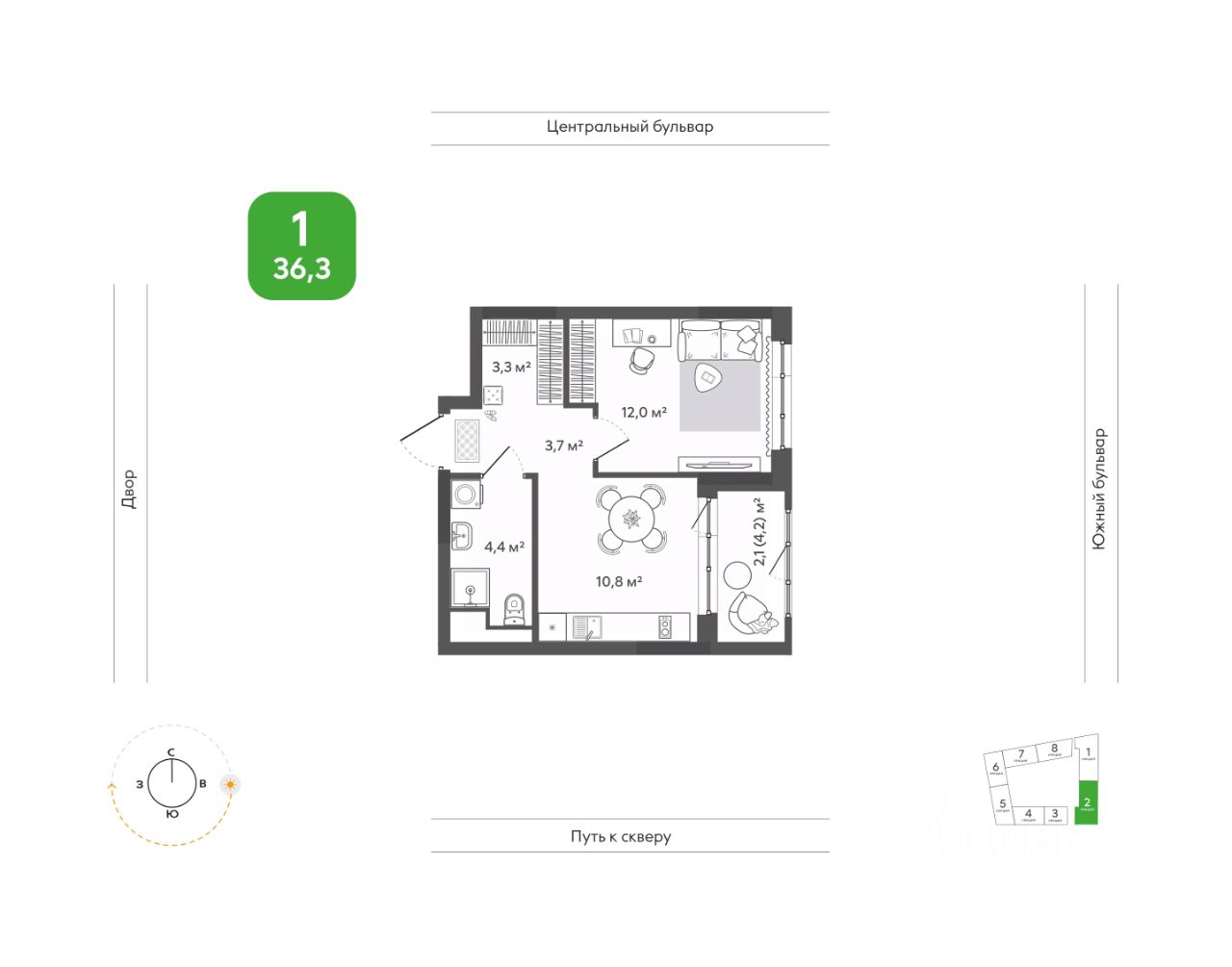 Продаётся 1-комнатная квартира в строящемся доме (Дом 1), срок сдачи: I-кв. 2028, общей площадью 36.3 кв.м., на 11 этаже. Жить в ритме природы, не теряя динамики города. В ''Сибирии'' свежий воздух встречается с динамикой города, создавая привилегию выбора: завтрак в кофейне на первом этаже дома или заряжающая пробежка в парке, культурный вечер в центре искусств или теплый семейный ужин на террасе. ''Сибирия'' становится частью нового городского кластера - с образовательной средой полного цикла, культурно-спортивным центром, медицинской инфраструктурой, современным центром искусств. Новые школы, детские сады, колледж с кампусом, новая поликлиника - все это делает жизнь комфортной и полноценной. ''Сибирия'' - это дом, где город открывает дверь в природу, а природа впускает в себя комфорт мегаполиса.