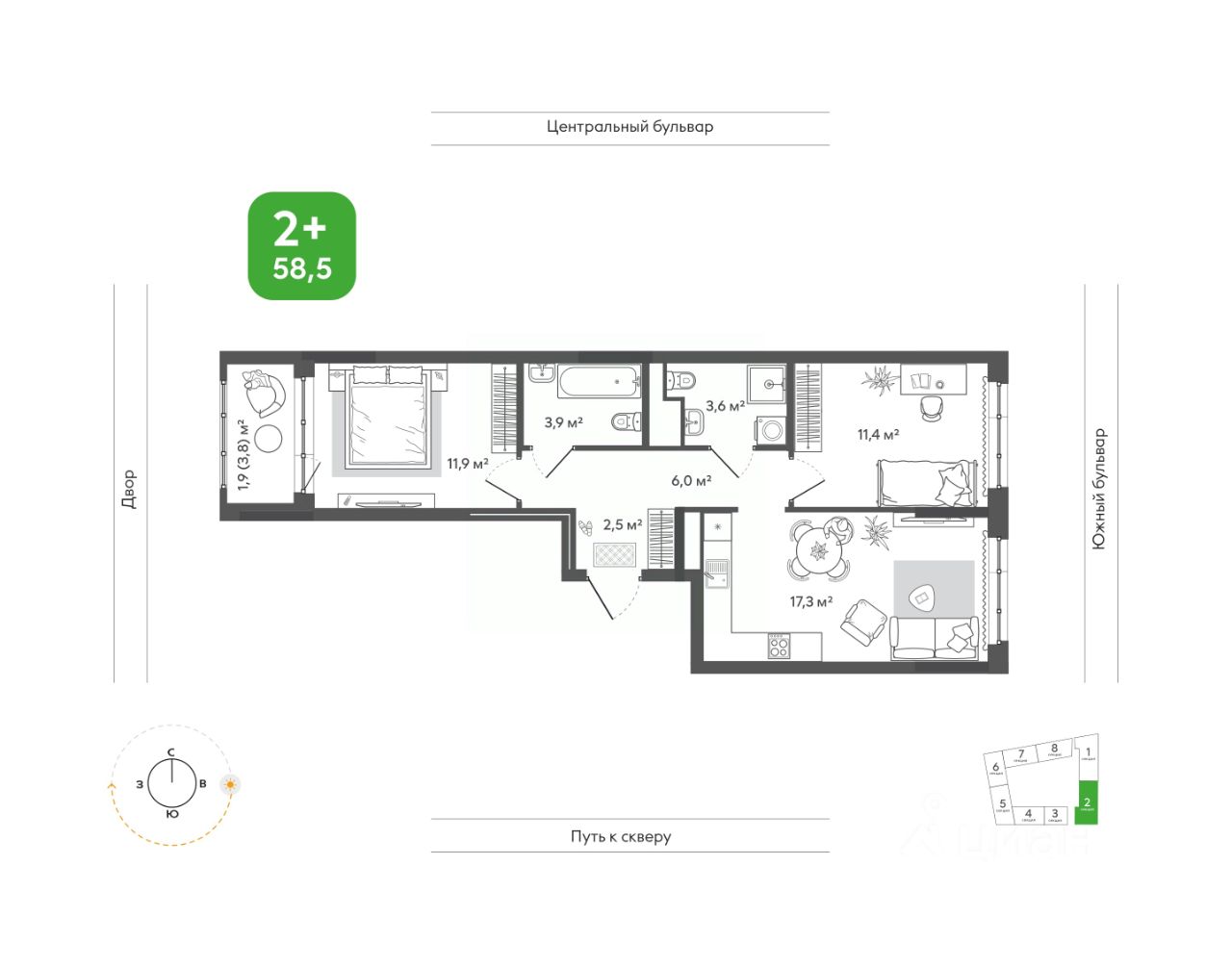 Продаётся 2-комнатная квартира в строящемся доме (Дом 1), срок сдачи: I-кв. 2028, общей площадью 58.5 кв.м., на 10 этаже. Жить в ритме природы, не теряя динамики города. В ''Сибирии'' свежий воздух встречается с динамикой города, создавая привилегию выбора: завтрак в кофейне на первом этаже дома или заряжающая пробежка в парке, культурный вечер в центре искусств или теплый семейный ужин на террасе. ''Сибирия'' становится частью нового городского кластера - с образовательной средой полного цикла, культурно-спортивным центром, медицинской инфраструктурой, современным центром искусств. Новые школы, детские сады, колледж с кампусом, новая поликлиника - все это делает жизнь комфортной и полноценной. ''Сибирия'' - это дом, где город открывает дверь в природу, а природа впускает в себя комфорт мегаполиса.