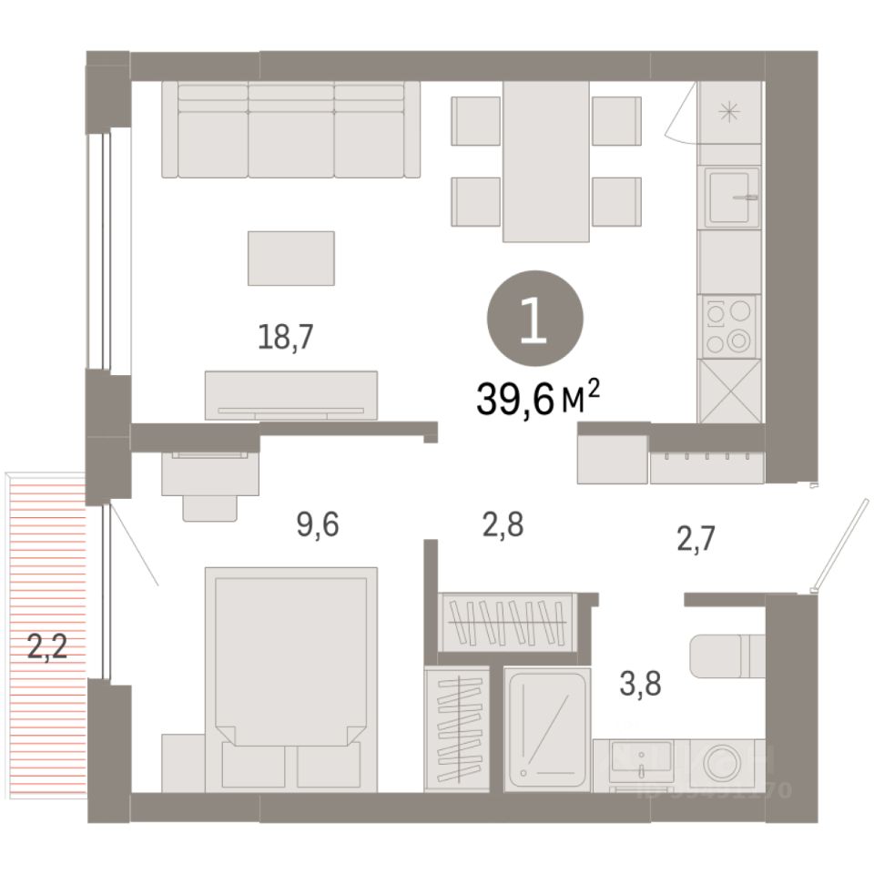 Квартира с кухней-гостиной и одной спальней в жилом районе ''Пшеница''. Особенности планировки: балкон, предчистовая отделка. квартиры в нашей базе: ПШЦ06.1-Ж2.6.5.