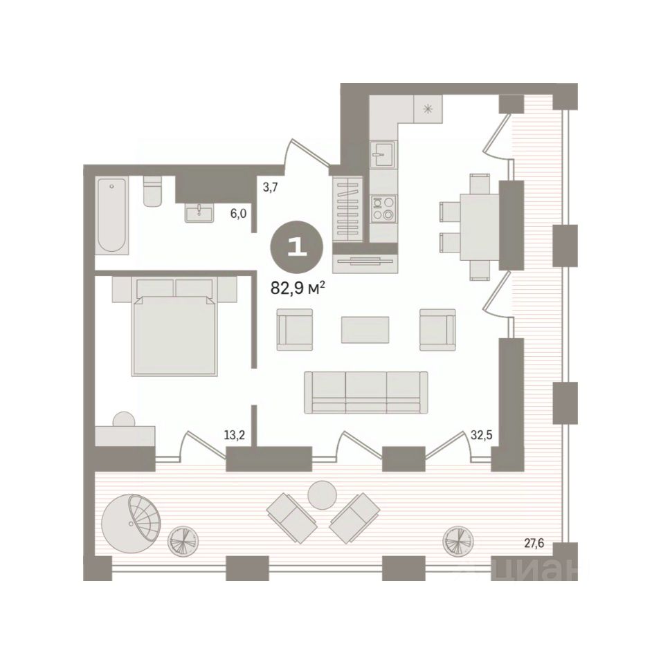 Квартира с кухней-гостиной и одной спальней в квартале ''Мылзавод''. Особенности планировки: предчистовая отделка, терраса на крыше. квартиры в нашей базе: МЛ-ГП4.2-9-9.30.2.