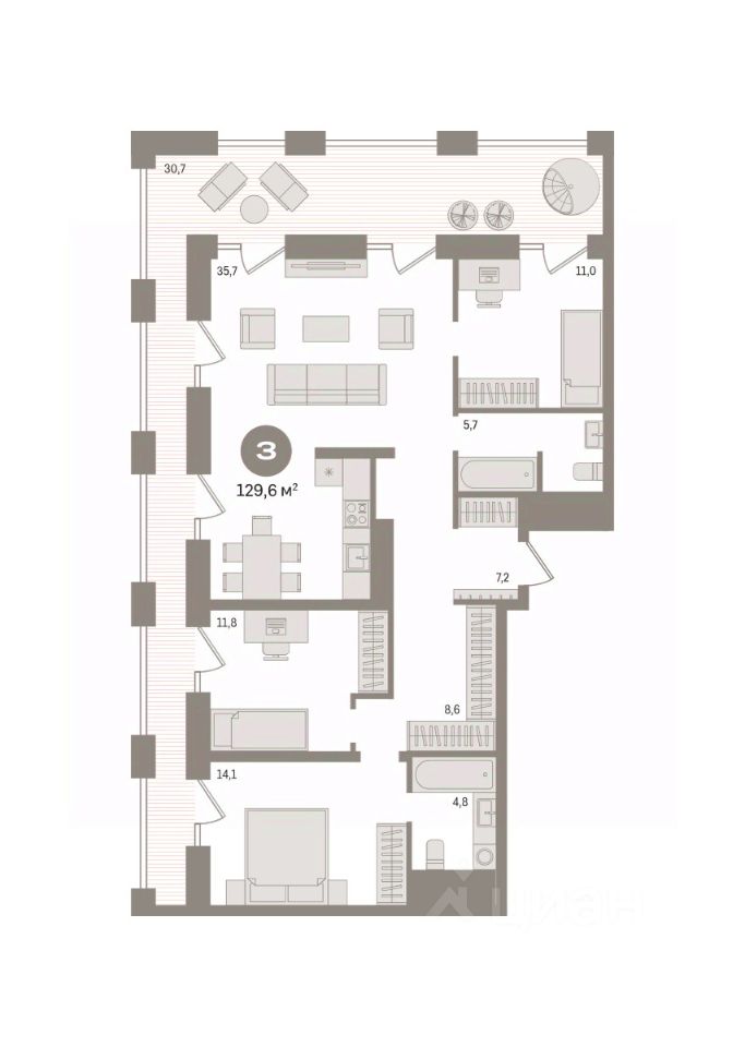 Квартира с кухней-гостиной и двумя спальнями в квартале ''Мылзавод''. Особенности планировки: предчистовая отделка, терраса на крыше. квартиры в нашей базе: МЛ-ГП4.2-9-9.27.5.