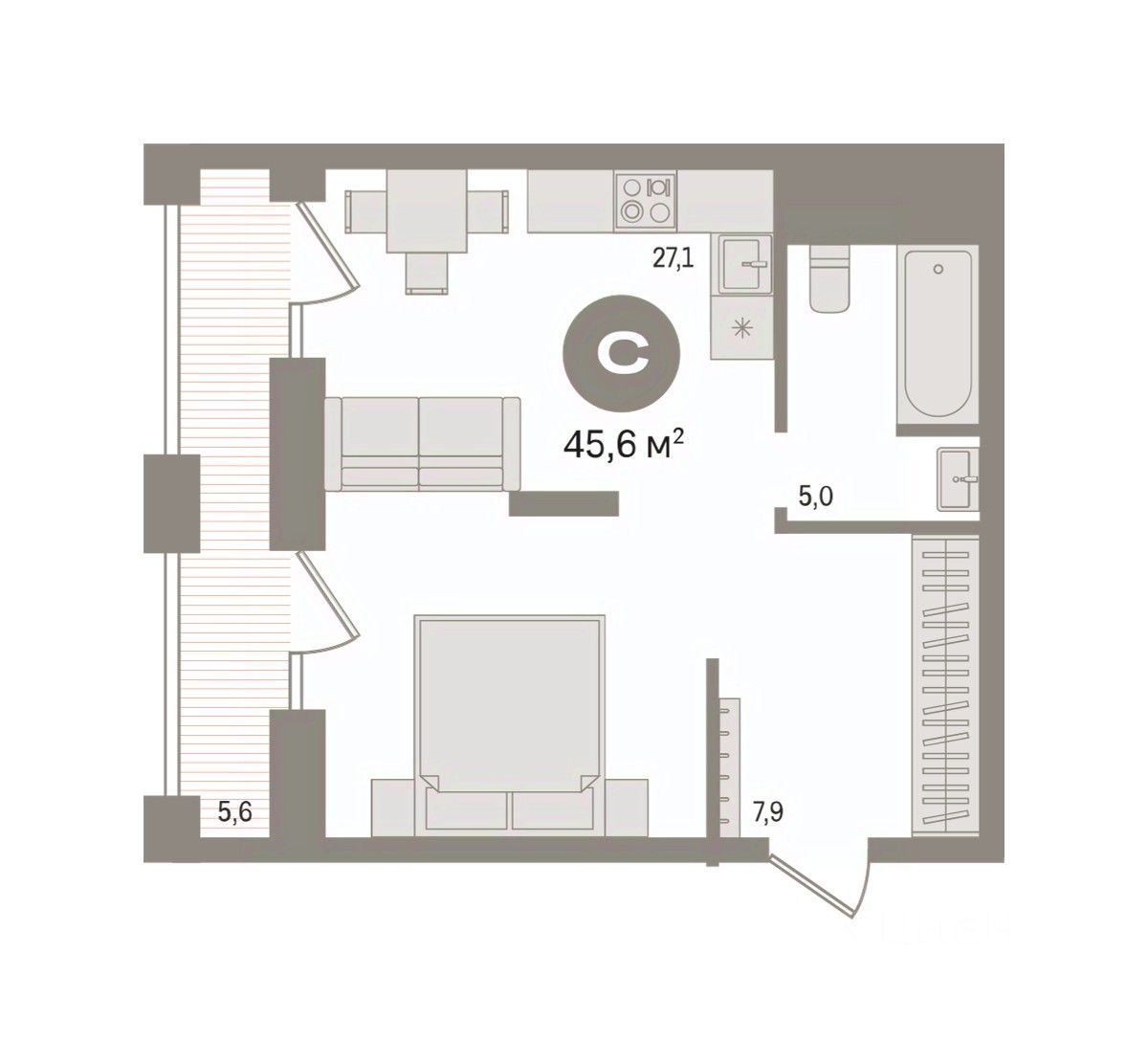 1-комн. студия от застройщика с предчистовой отделкой в Квартал Мылзавод на 29 этаже. Общая площадь: 45.57 кв.м. Высота потолков 2.72 м.