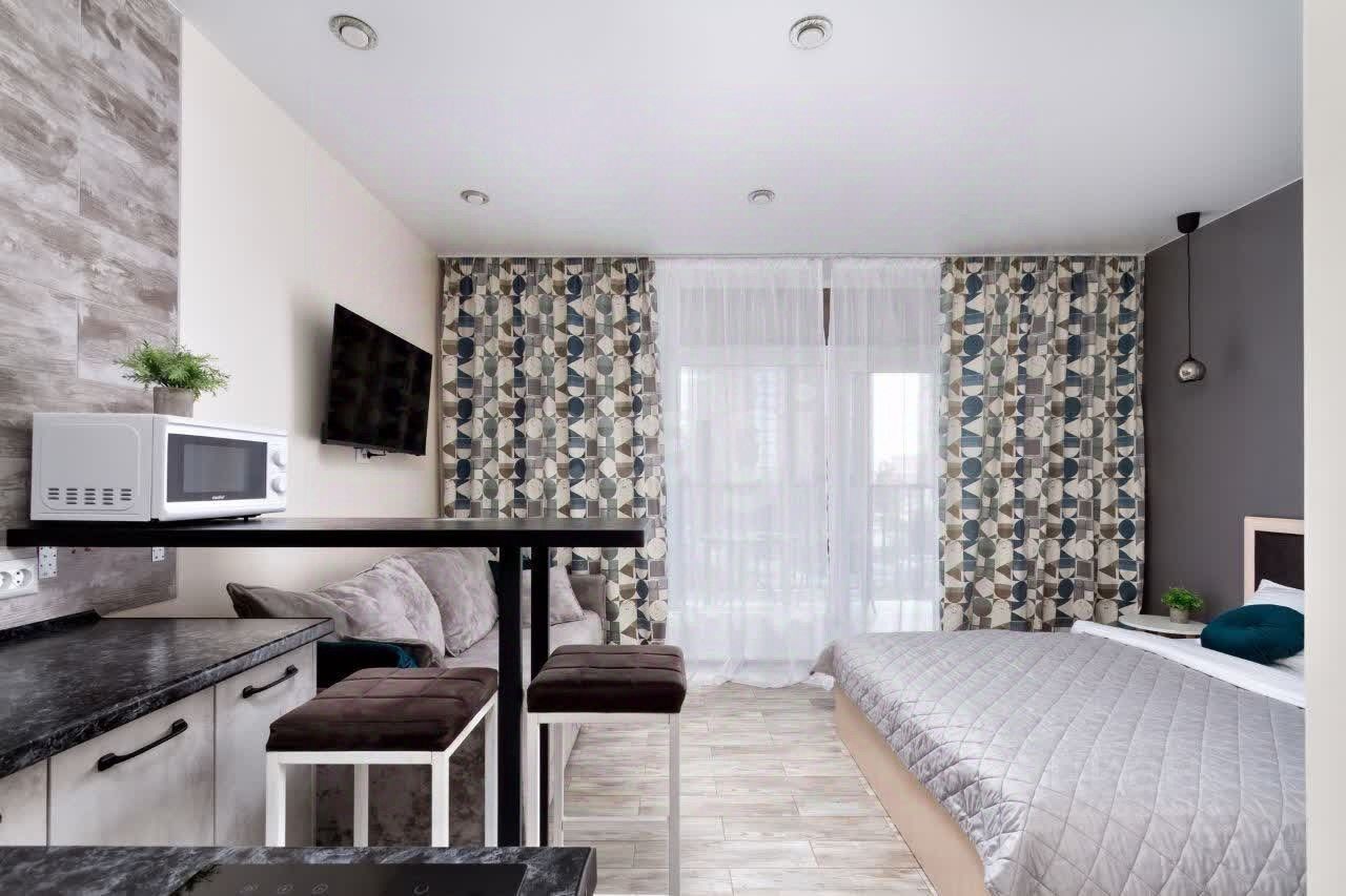 В квартире сделан евроремонт, всё продумано до мелочей для вашего комфорта. Просторная студия полностью меблирована: в комнате и на кухне есть вся необходимая мебель. Установлена современная техника — кондиционер, холодильник, телевизор и стиральная машина. В ванной комнате оборудована душевая кабина. Есть балкон, где можно наслаждаться свежим воздухом.