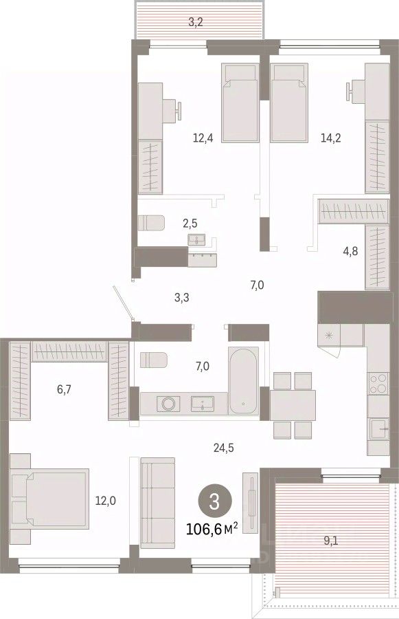 Продается трехкомнатная квартира с предчистовой отделкой в Микрорайон ''Европейский Берег'' на 7 этаже. Общая площадь: 106.6 кв.м., жилая: 38.6 кв.м., площадь просторной кухни-гостиной: 24.5 кв.м. Квартира - распашонка, без проходных комнат, окна выходят на paзные стороны дома. В квартире один балкон и одна лоджия, один совмещенный и один раздельный санузел. Наличие террасы в квартире открывает возможность для обустройства дополнительной площади. Высота потолков 2.82 м.