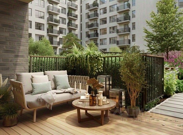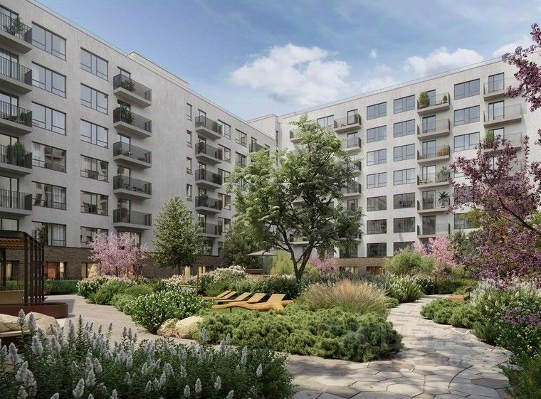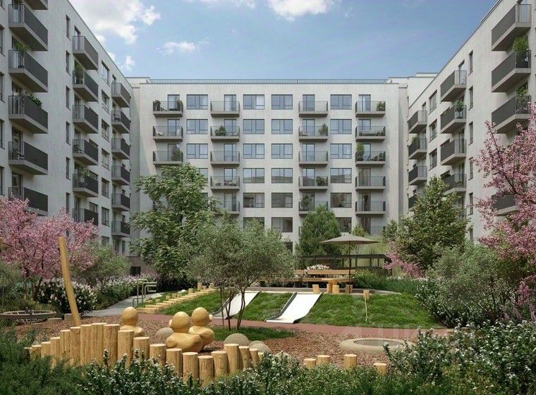 Во дворах микрорайона создано приватное пространство для жителей. Дворы имеют интенсивное озеленение и выполнены в концепции тихого сада с газоном, травами, деревьями и кустарниками. Деревья привезены из европейских питомников и высажены сразу большими. Установлены детские площадки, уличные тренажёры, спортивные корты, предусмотрены места для отдыха взрослых и прогулок.