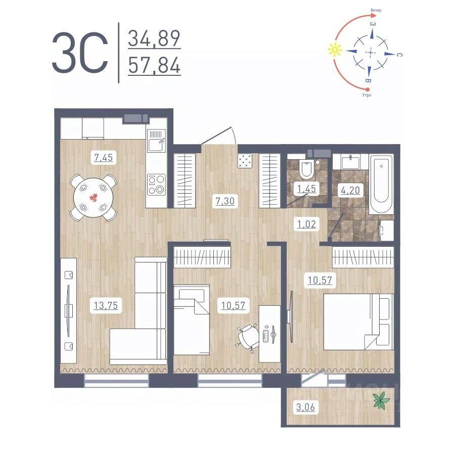 Общая площадь57,84 м2