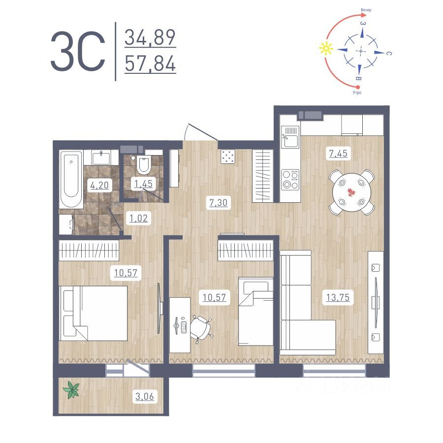 Общая площадь57,84 м2