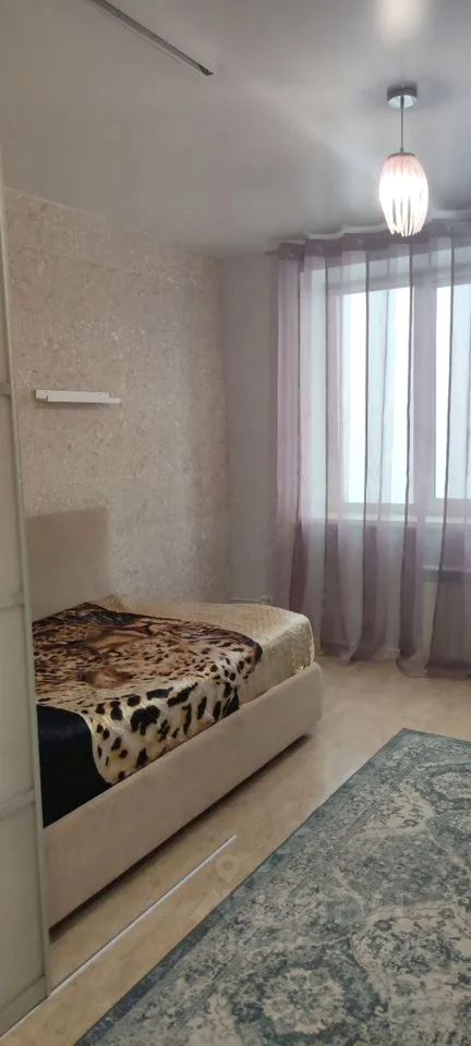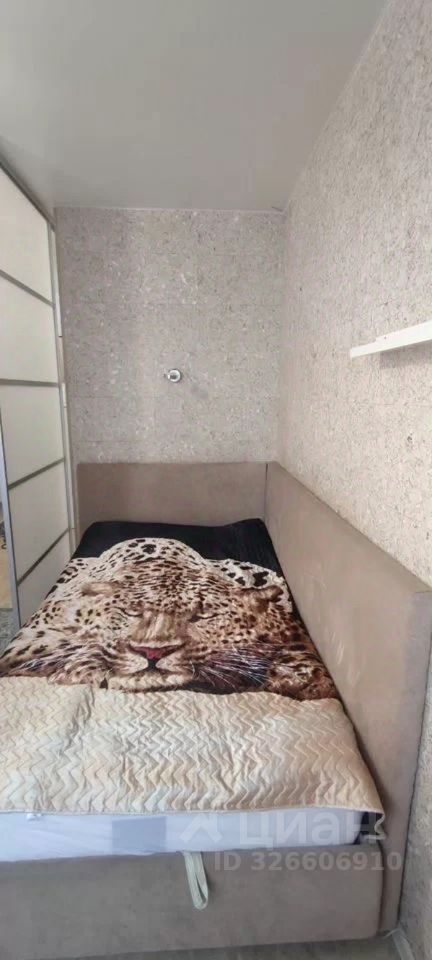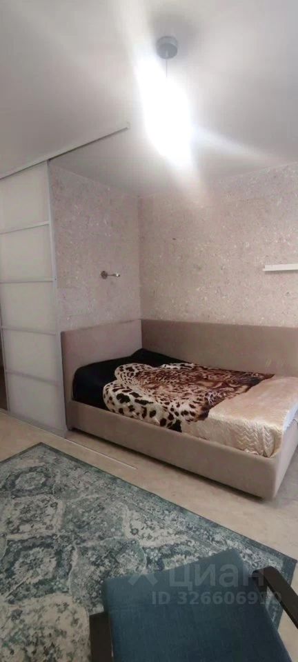 Жилая зона выделена раздвижной перегородкой, что позволяет отделить спальное место от общей части комнаты. Установлена кровать, есть зона отдыха и место под рабочий стол. Комната наполнена естественным светом, окна выходят на сторону с хорошей инсоляцией, благодаря чему пространство остаётся светлым в течение дня.