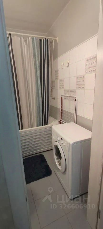 Санузел совмещённый, с ванной. Установлена стиральная машина, сантехника в рабочем состоянии, отделка выполнена в светлой цветовой гамме, что визуально расширяет помещение и делает его аккуратным.