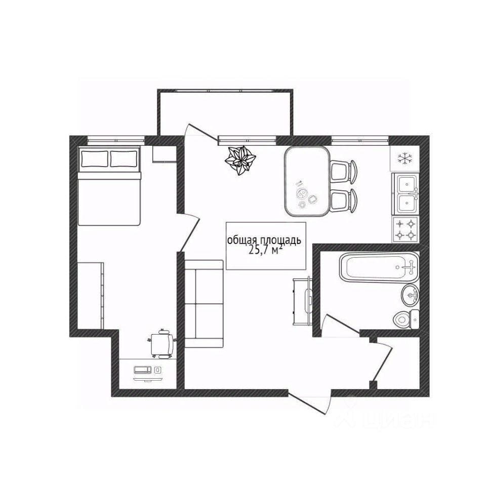 Вся мебель и техника остаются: кухонный гарнитур, плита, холодильник, стиральная машина, диван, кресло, стол, стулья. Высокие потолки 2,7 метра и просторная лоджия добавляют ощущение простора и света.