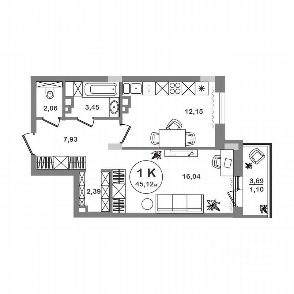 Прекрасная квартира с большой кухней, которую по праву можно называть 2-к студия.